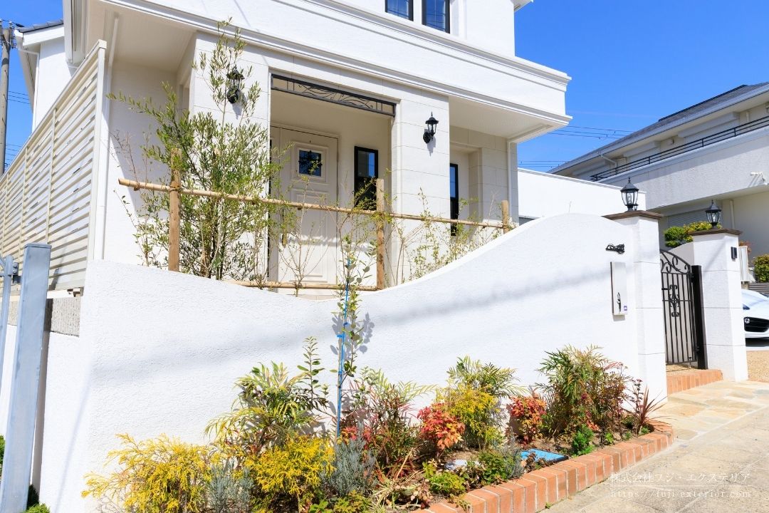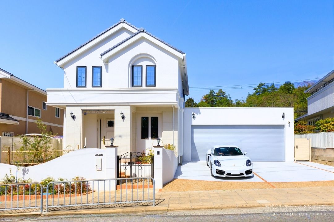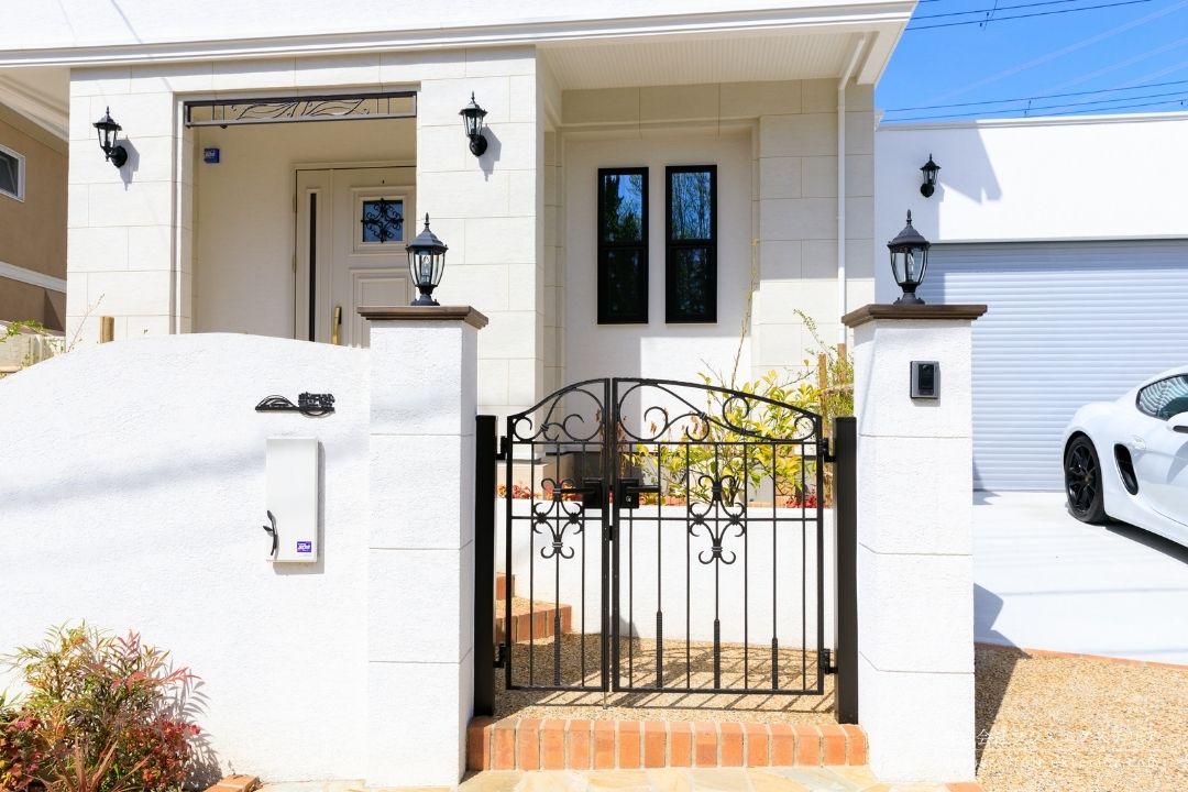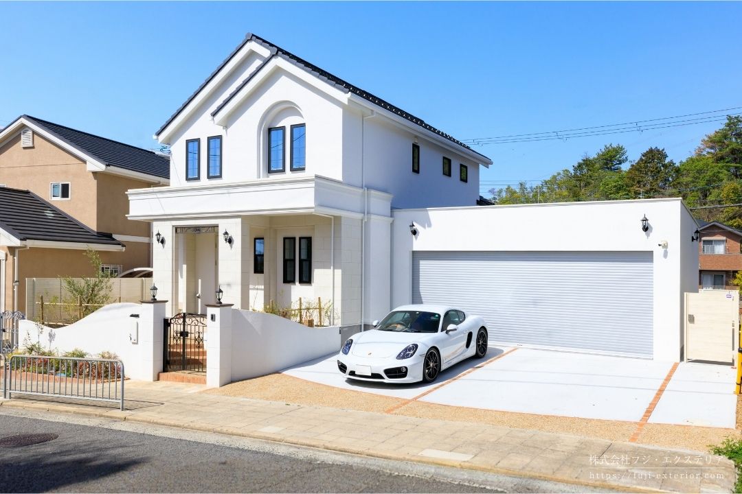 間口の大きな敷地に、白と黒のコントラストが美しい建物。人気の高いセミクローズ外構です。その横に4台以上のお車が駐車出来る大型ガレージを造りました。防犯にも配慮された、洗練された素敵なエクステリアです。