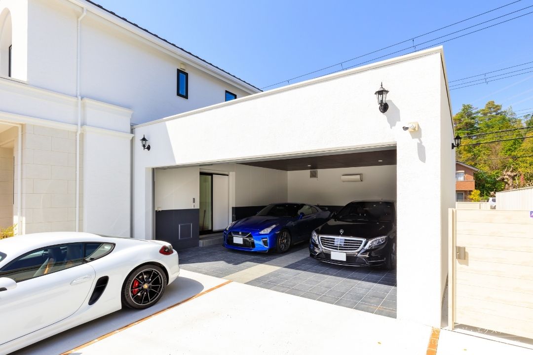床のタイルは、駐車の目安になるよう2色に張り分け、まるでディーラーのショールームのようなラグジュアリー感があります。ガレージ内部には換気扇とエアコンも設置し、排ガス、気温にも完璧に配慮しました。