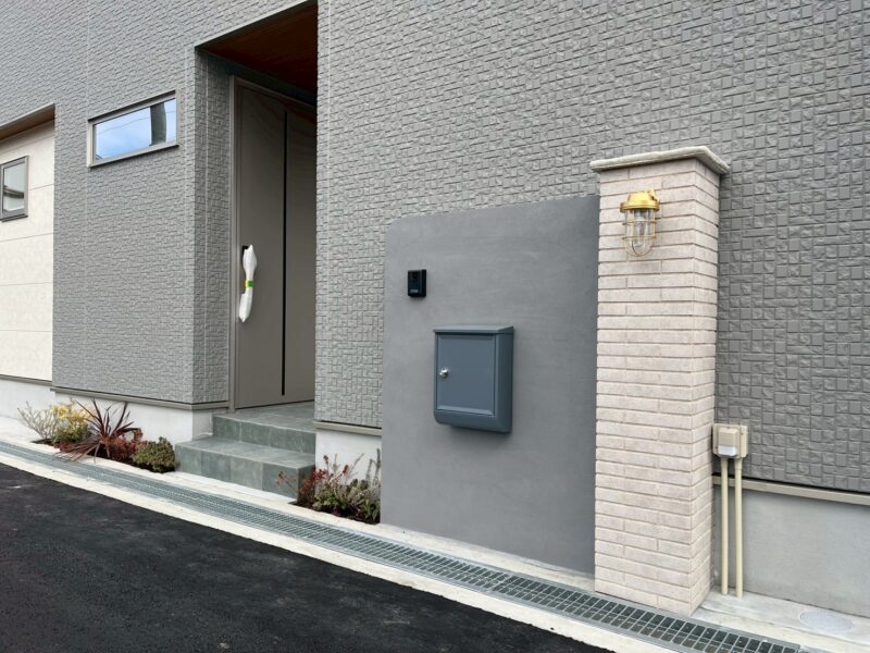 建物のブラック&シルバーの組み合わせを外構にも取り入れました。門柱に貼ったタイルは、ニッタイ/コンブリオの7番です。アプローチとガレージの床の乱形石は、アイランド/バサルトストーン。玄武岩で耐久性があります。マットなブラック色は上質で表情豊かな空間にぴったり。アプローチのアールデザインはお施主様のリクエスト。カチッとした素材やデザインの中にアールの表情がある事でやわらかい印象もプラスされますね♪