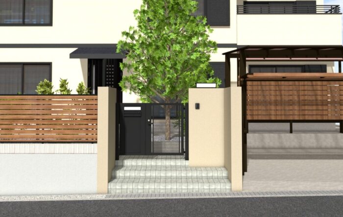 門扉の袖壁は既存を利用し、モルタルで目地を詰めてスタッコの吹きつけで塗装しました。門扉は新しくポストが一体型の四国化成/クレディ袖門扉を採用しました。