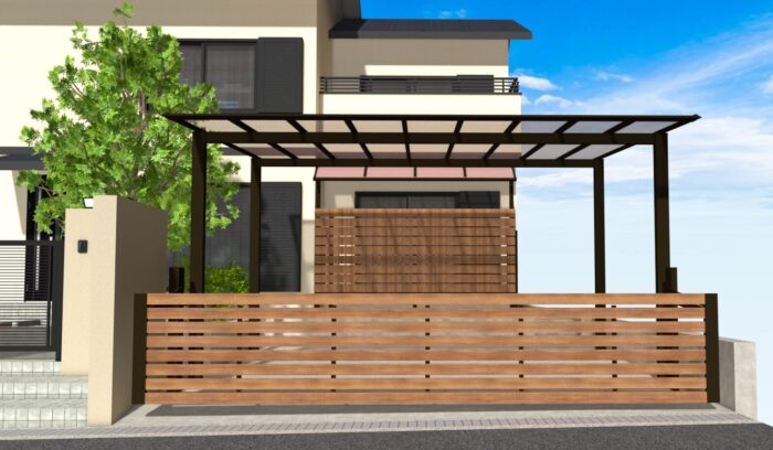 手動であったオーバードアは機能面を考え電動の三協アルミ/ラビーネワイドに変更、合わせてカーポートも同じ三協アルミ/スカイリードを設置しました。屋根材はポリカのブラウンスモークです。手動から電動になることで、その都度車から降りる手間がなくなり、ストレスフリーになりますね。