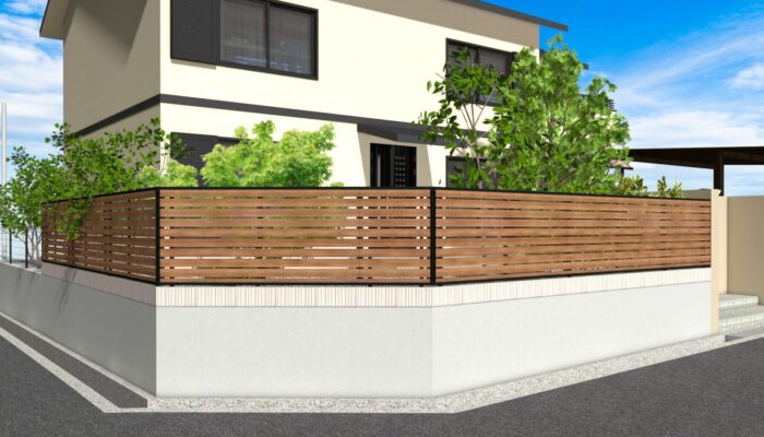 道路からの目線が気になる部分はメッシュフェンスを撤去し既存の擁壁上に、太陽エコブロックス/ストライプ(アイボリー)を1段積み足し、三協アルミ/シャトレナⅡ・2S型を設置しています。