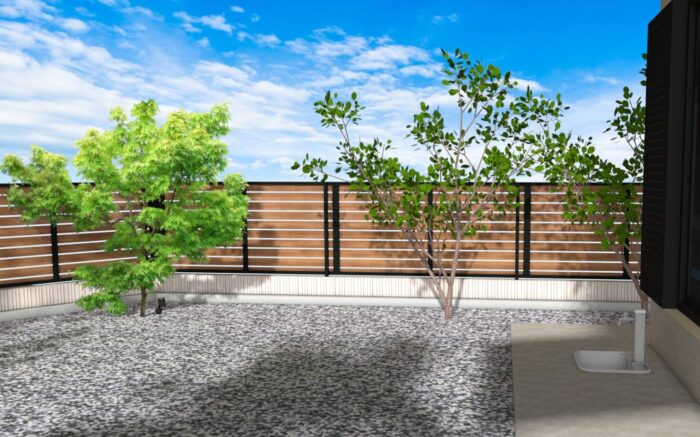 また今まで、すだれで目隠ししていた居間部分は同じ三協アルミ/汎用部材でアルミスクリーンを現地で造作するタイプなので、フェンス材の幅やすき間が自由に設定出来ます。こちらは、フェンス材を150mm、すき間は20mmとしました。完全な目隠しではなく向こう側が見え、視線はやわらかく遮る寸法です。風が抜けやすいのも良いですね。全体的に揃えたアルミの木彫カラーはチェリーウッド。明るい木彫で一体感があり素敵です。