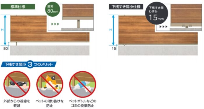 フェンスは、ブロックとの間にすき間があるものが通常で、特に目隠しを目的とした場合はすき間カバーを取り付けて対応します。が・・こちらのフェンスは元々すき間が狭く気になりません。フェンス下の隙間が気になる方にはこちらのタイプがお勧めです♪