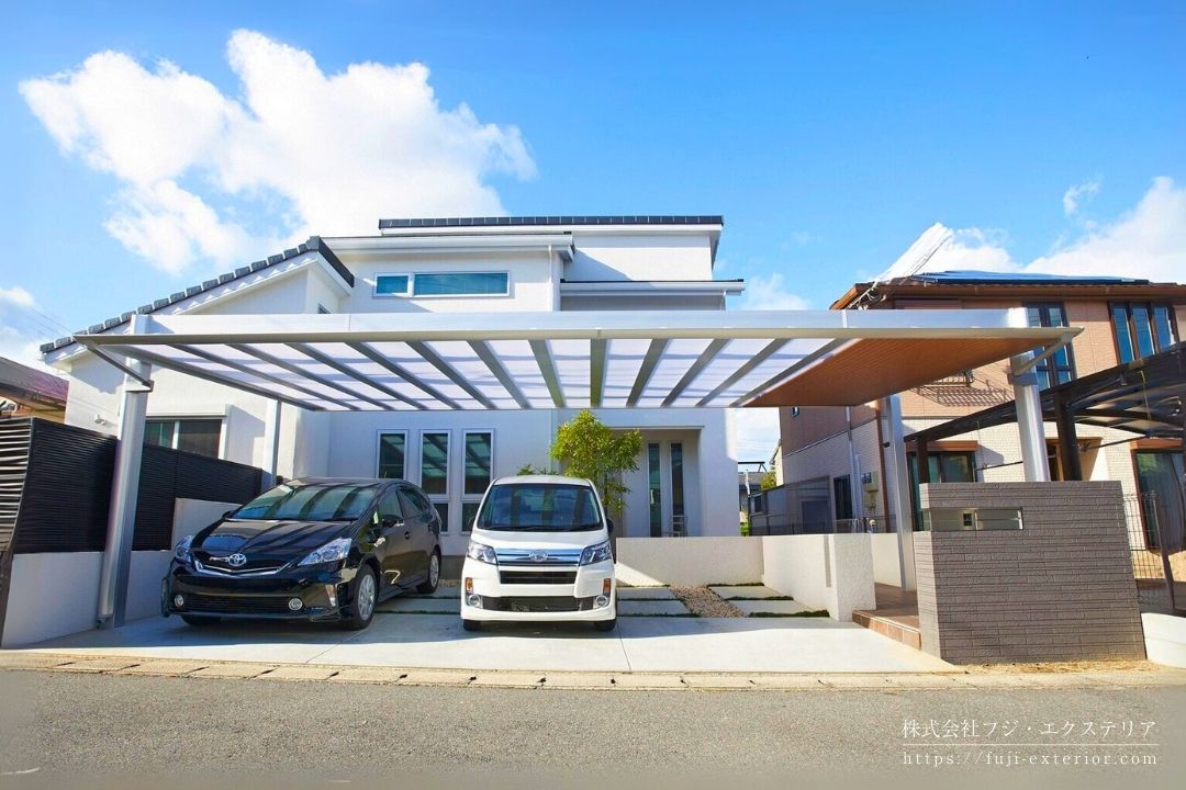 LIXILアーキフィールド3台用 間口9mのアプローチ屋根も兼ねた大型カーポート