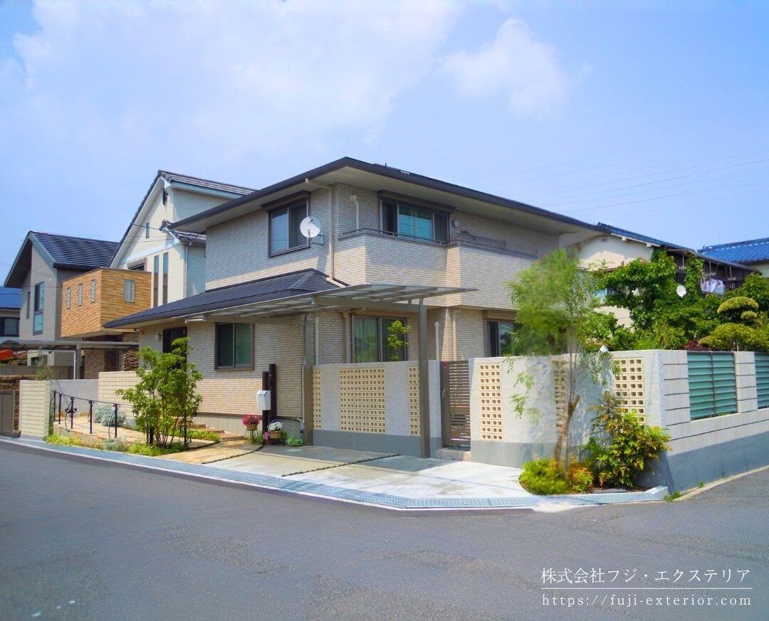 門まわりは有孔レンガで塀を作り、オリジナル手すりと乱形石張りでエレガントなスロープを作りました。庭は和と洋が融合された、機能的かつ四季折々の樹木の成長過程を楽しめる癒しの空間をコンセプトにしました。