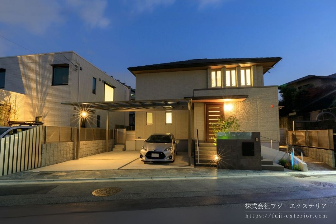 カーポートにつけた人感センサー付スポットライトで、夜間も明るく安心。照明は防犯面でも欠かせない大切なアイテムです。