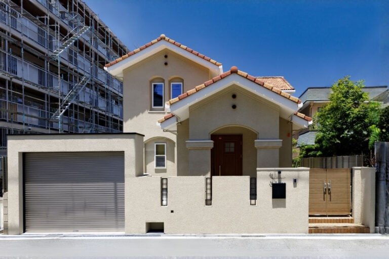 三角屋根に3色使いの瓦がキュー … 続きを読む 赤いオーニングテントがキュートなスパニッシュ エクステリア