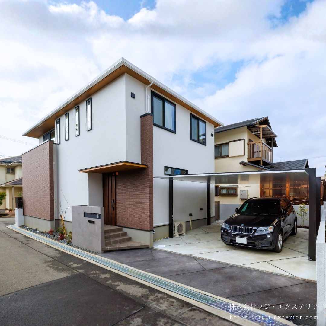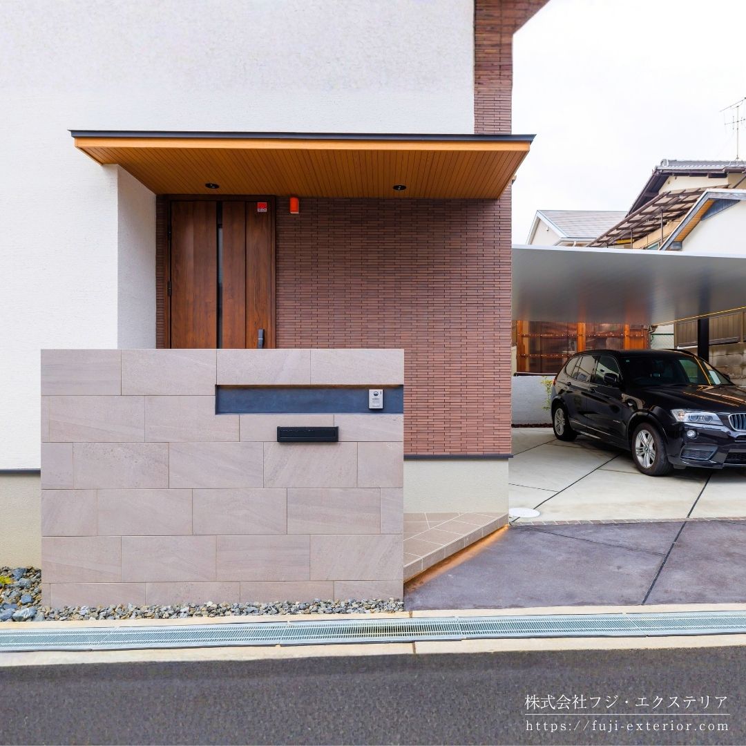 大きなタイル貼りの化粧壁がインパクトのある外観です。お施主様こだわりのこの素敵な化粧壁に似合う外構デザインがご希望でした。