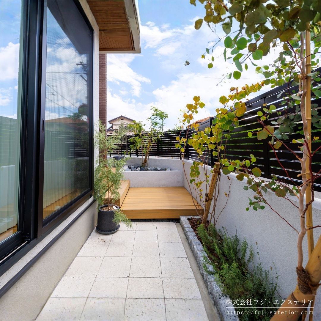 お庭は奥様のテリトリーです。御影石のピンコロで作った花壇には、ポポラス、レモンユーカリ、マルバの木を植樹。表面にはウッドチップを敷き詰めました。