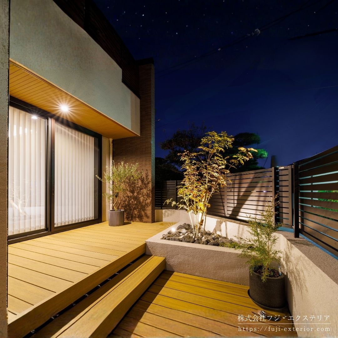 夜のライティング風景。植栽が成長すれば また素敵な陰影が生まれる事でしょう。地域の安全・防犯や美観にも役立っています。
