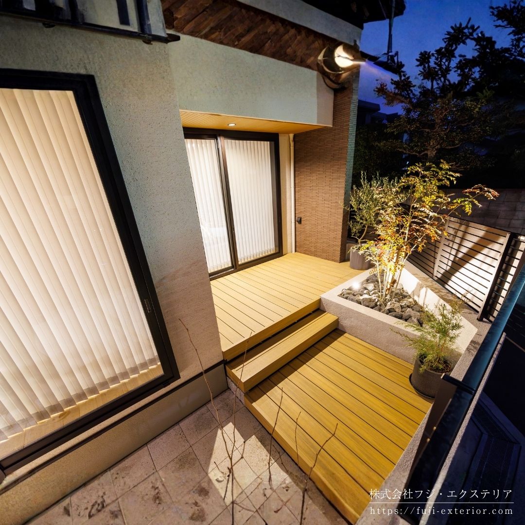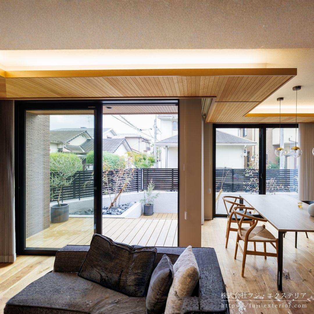 デッキテラスにもご主人様のこだわりが・・四国化成ファンデッキHG、優しく自然な色合いのティンバーカラーオーク色を選択されました。