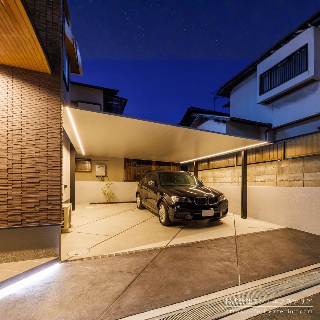 カーポートの天井にはシームレスラインライトを左右に取り付け、ショールームのような美しいライティングに。