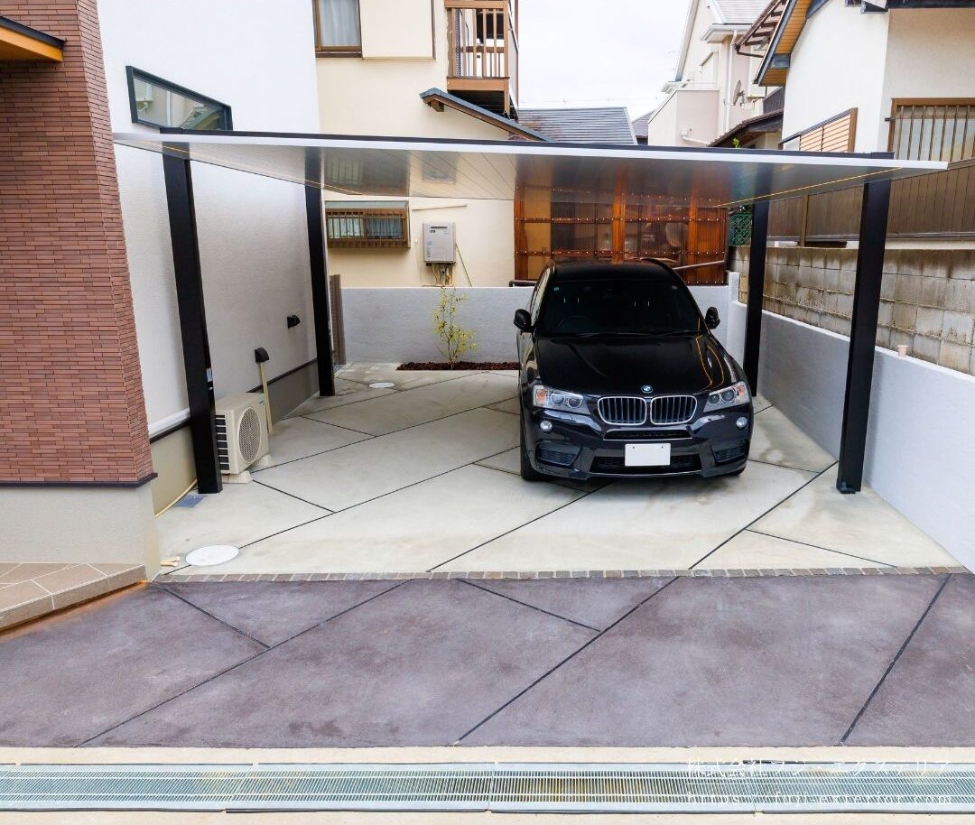 カーポートは LIXIL カーポートSC。シャープですっきりしたフラットデザインが魅力です。道路側のアプローチはコンクリートに色を付けてガレージとの境界を造っています。
