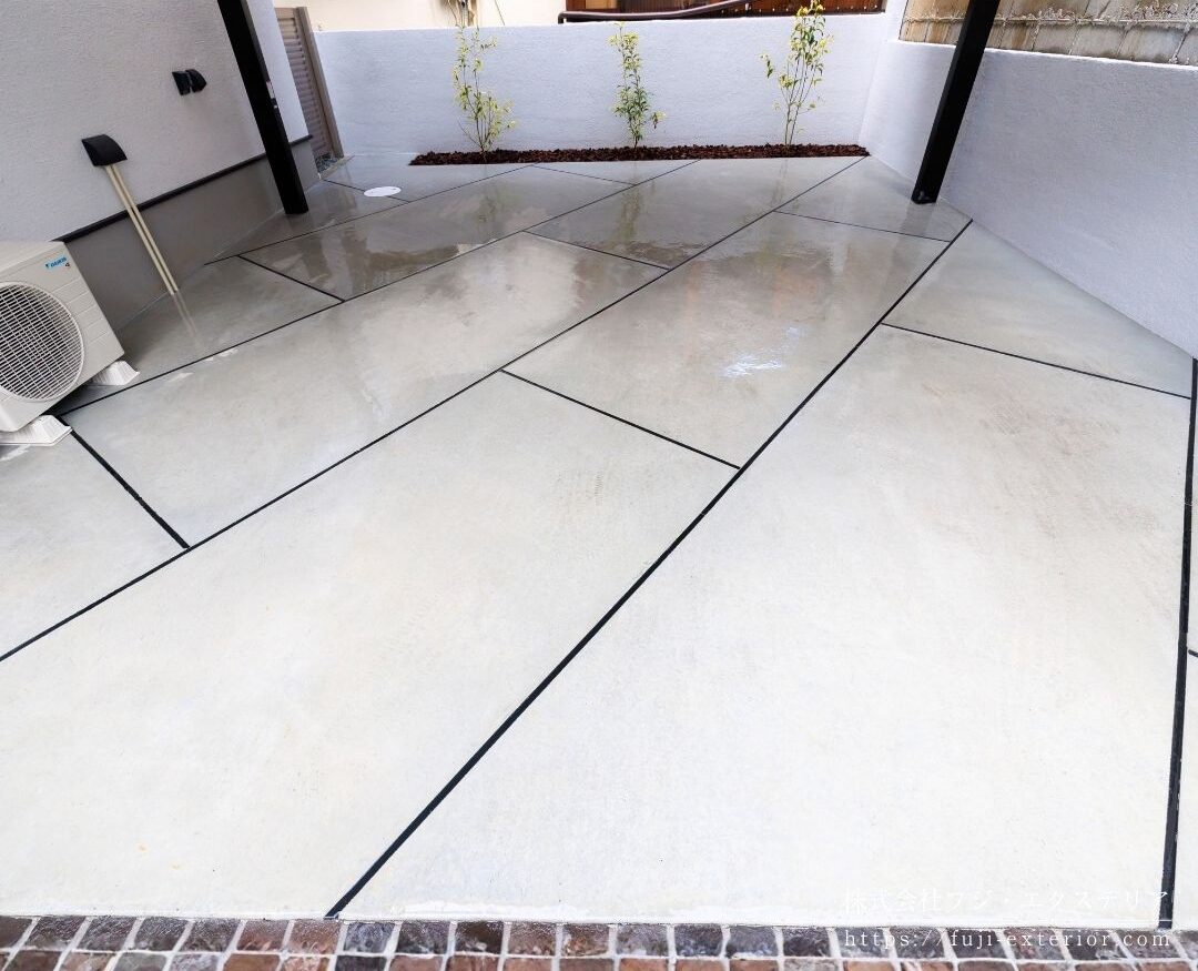 床の素材は遮熱性能のあるコンクリート平板 ダルメペイブ 。ナチュラルなグレーに白と黒の石を自然な形で散りばめており、リラックスした雰囲気を作り出します。花壇側面には排水用溝も造り、水たまりが出来にくい工夫がされています。