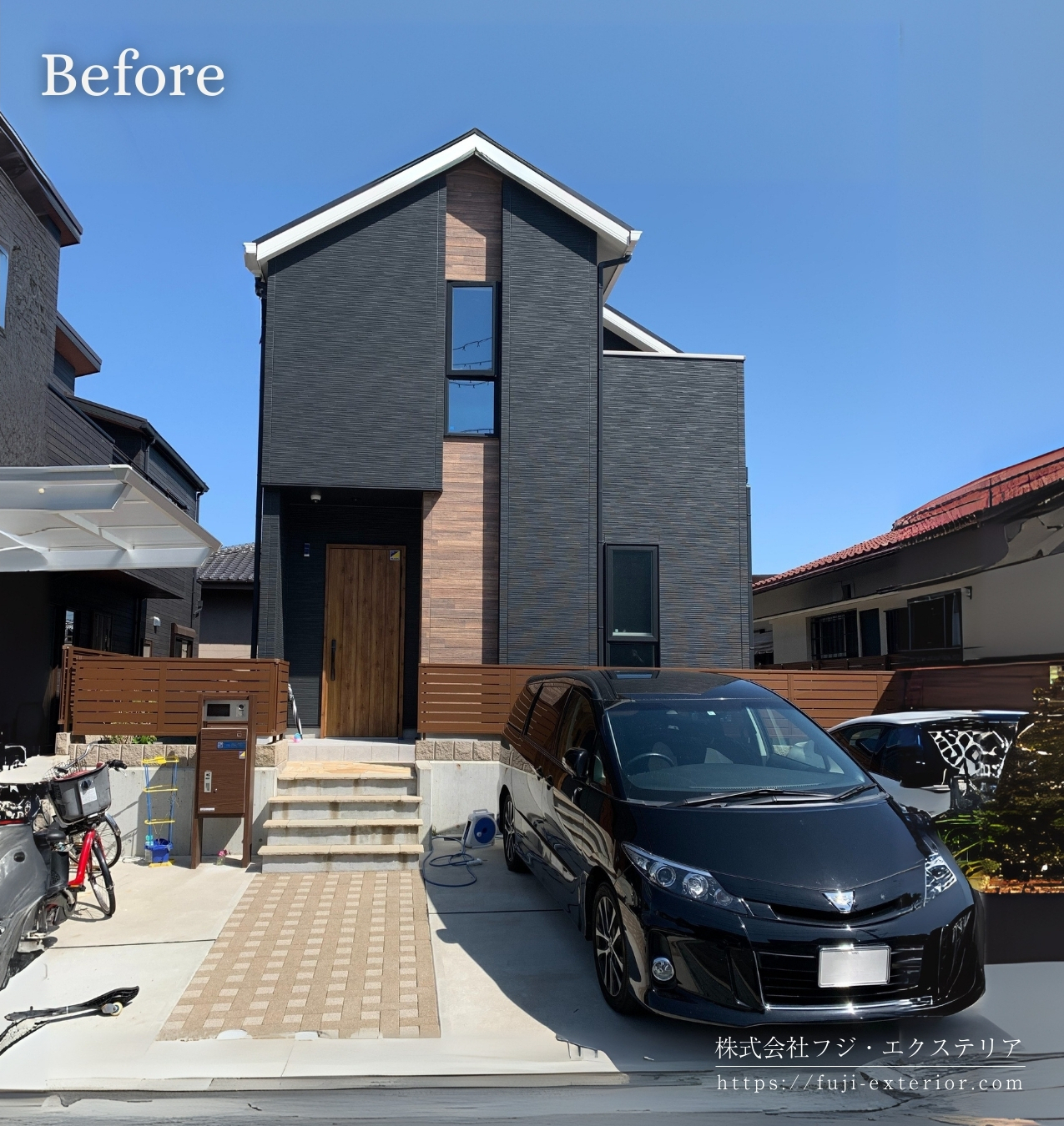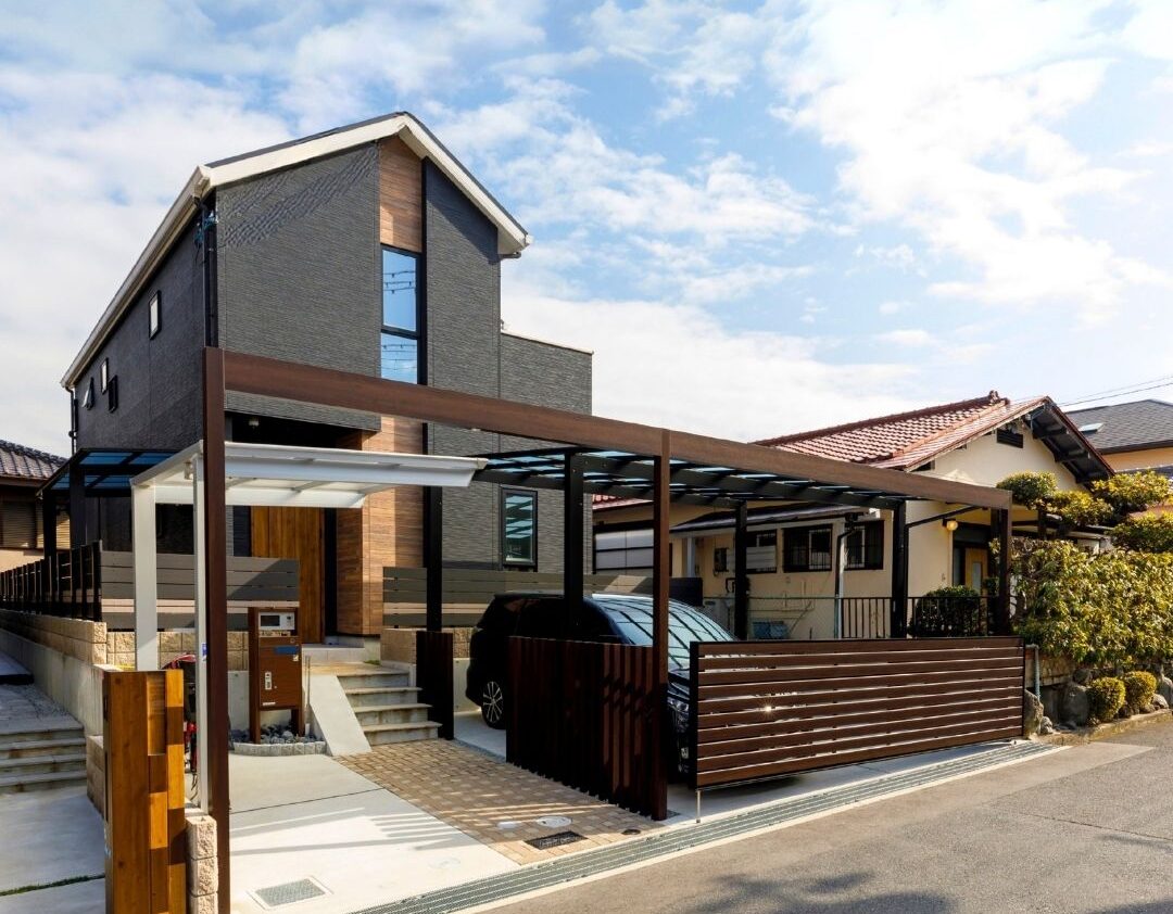 オープン外構からクローズ外構に変更、家と合うシンプルモダンで高級感のあるエクステリア、シャッターゲート&カーポート屋根、LDKの目隠し、ウッドデッキ、テラス屋根、駐輪場、メンテナンスフリー、門柱廻り等々、大規模なリノベーションです。