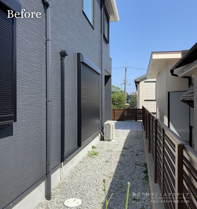 敷地4面のアルミフェンスを全て撤去し、化粧ブロック+目隠しフェンス(エコモックフェンス)を設置。再生樹脂製で腐りにくく、質感が良く、低コスト。カラーや幅の組み合わせもカスタマイズができる人気のフェンスです。板材の隙間は1cmに設定し、完全目隠しではなく通風、採光も確保しました。