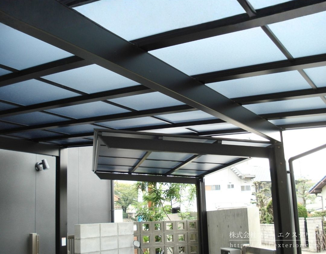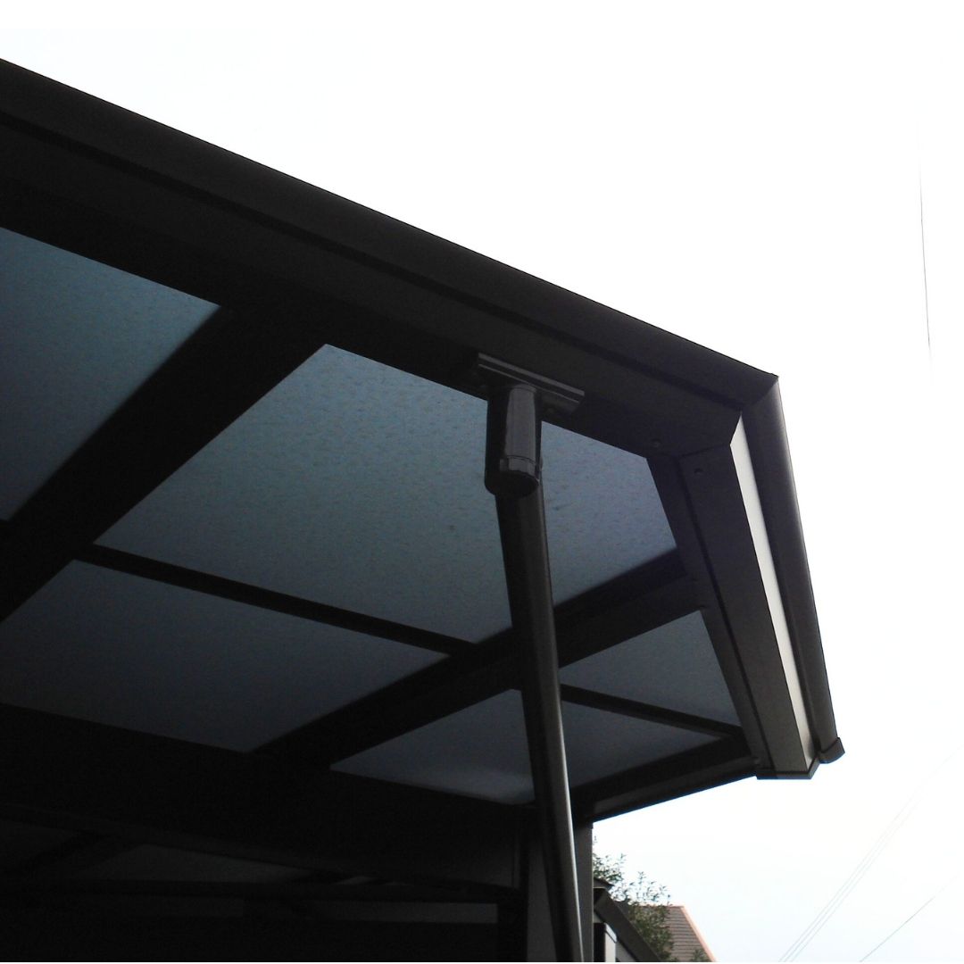 カーポート屋根の越境部分はカット加工し、ミニタイプと組み合わせて、敷地を最大限に屋根掛けしました。家との隙間には雨が入り込まないようにスリムアートでカバー。