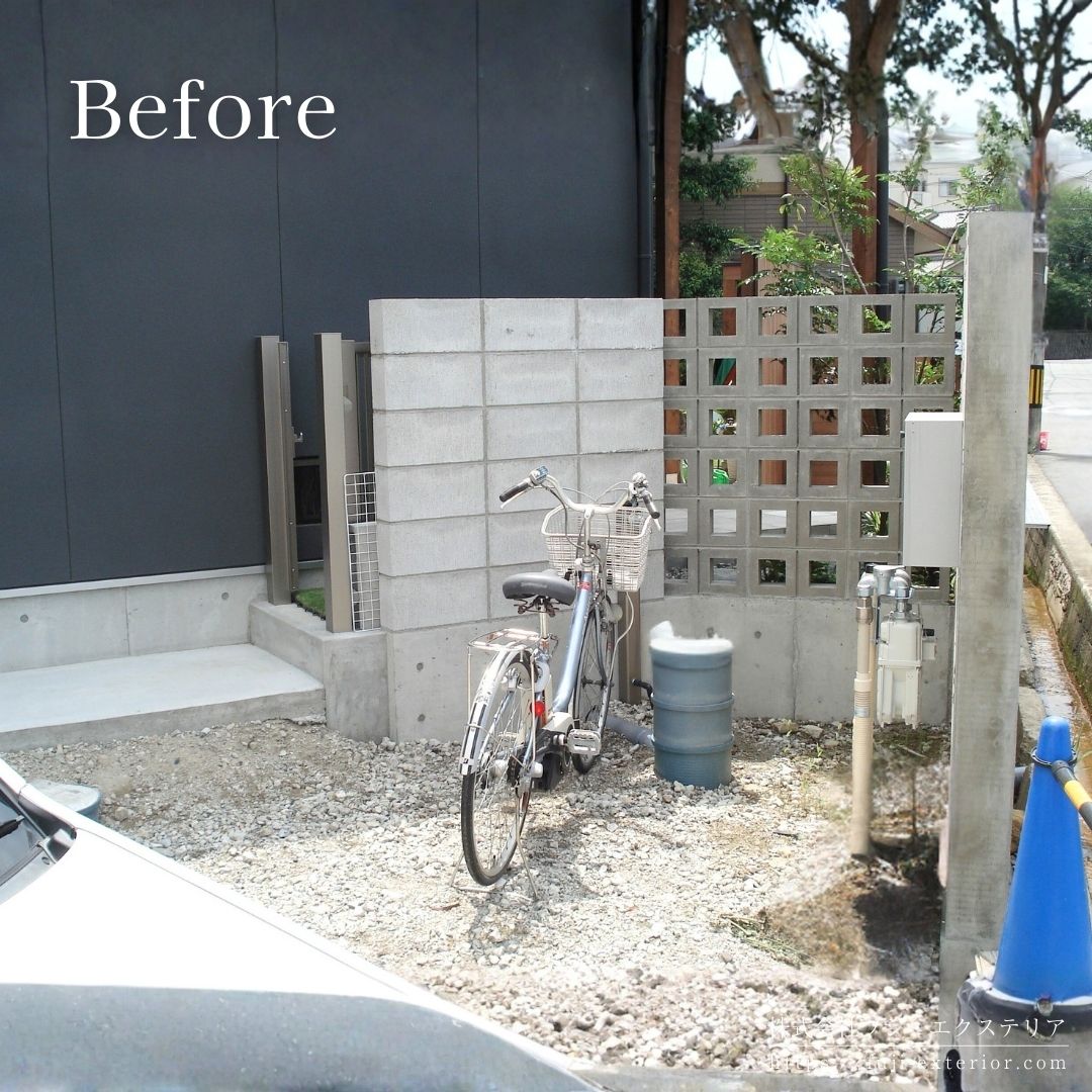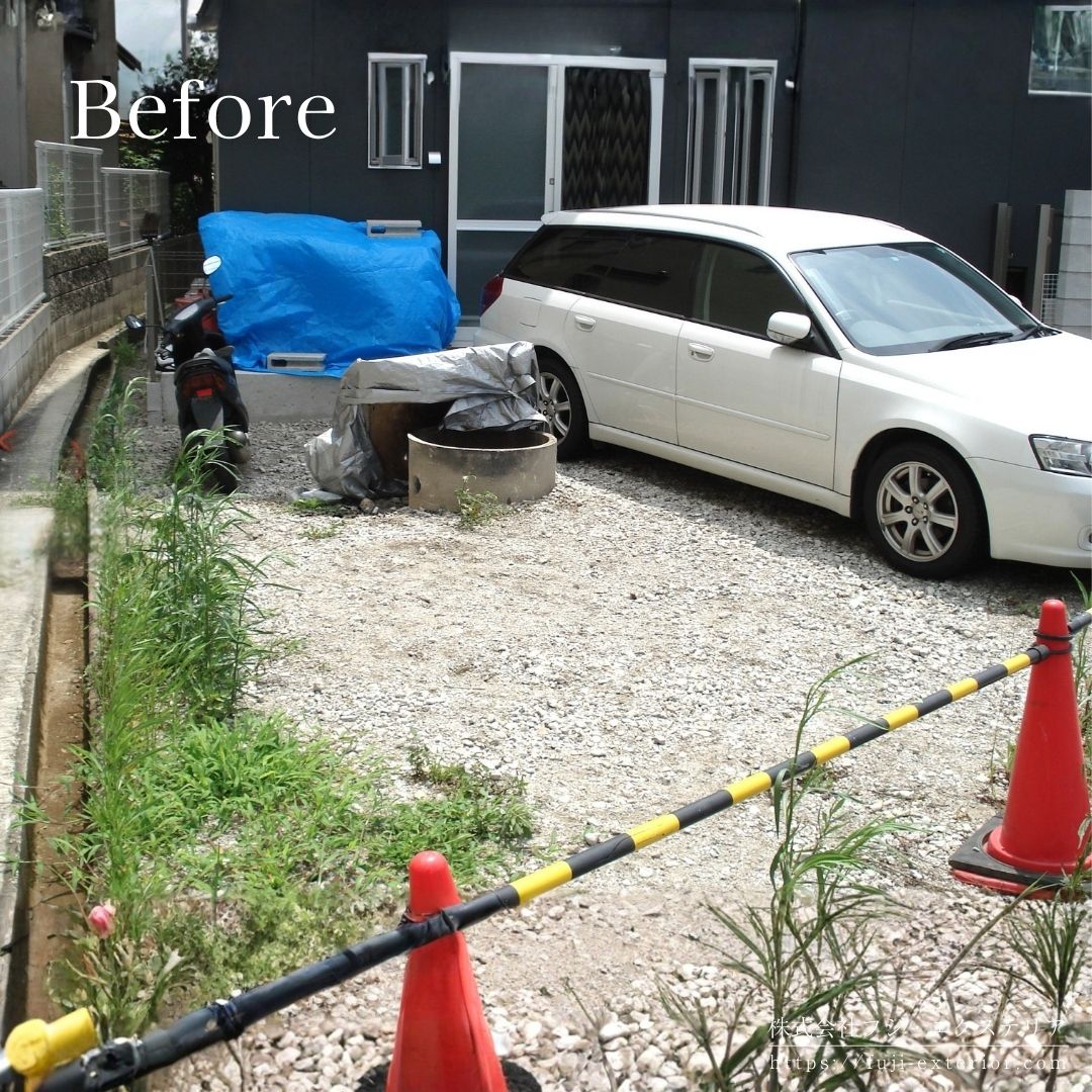 I様はご自宅を建て替えられましたが、庭は手つかずの状態でした。庭の中央には今も利用中の井戸があり、三角形の敷地でした。ご希望は、①三角形の土地に可能な限り屋根掛け ②車2台+バイク2台を駐車 ③井戸はそのまま使用 ④門扉をつけてクローズ外構に ⑤物置を設置。