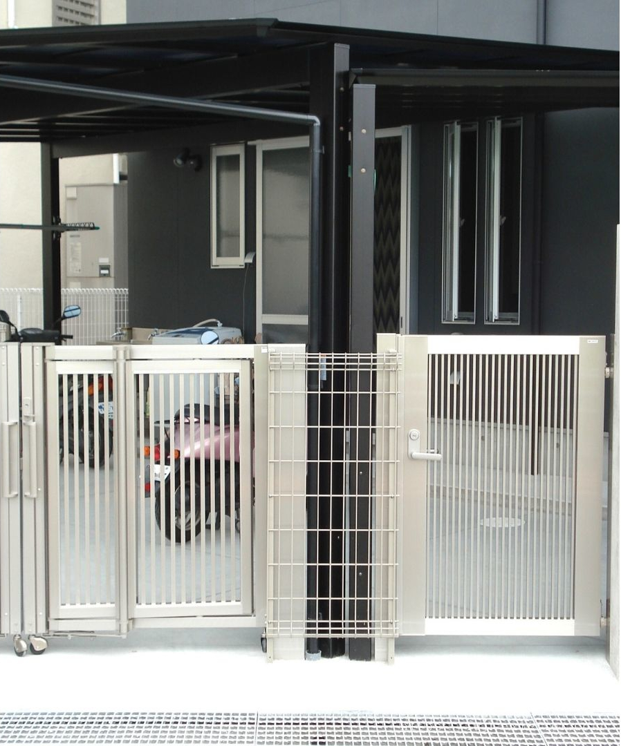 道路境界には伸縮門扉+門扉(四国化成 クレディ、クレディオレド)で敷地内をしっかりガード。