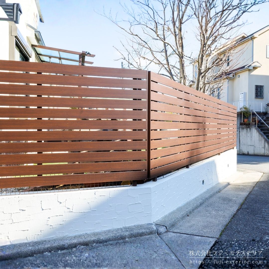 目隠しフェンスは人気の再生樹脂製 木彫エコモックフェンス。一般的なアルミフェンスは現場加工は基本不可ですが、こちらは1枚ずつ現場で取付けるので、板の隙間の間隔や色の組み合わせを自由にカスタマイズできます。劣化しにくく低コストで、表面にはウッドパウダーが混入されているのでほのかに木の香りがするのも特徴です。
