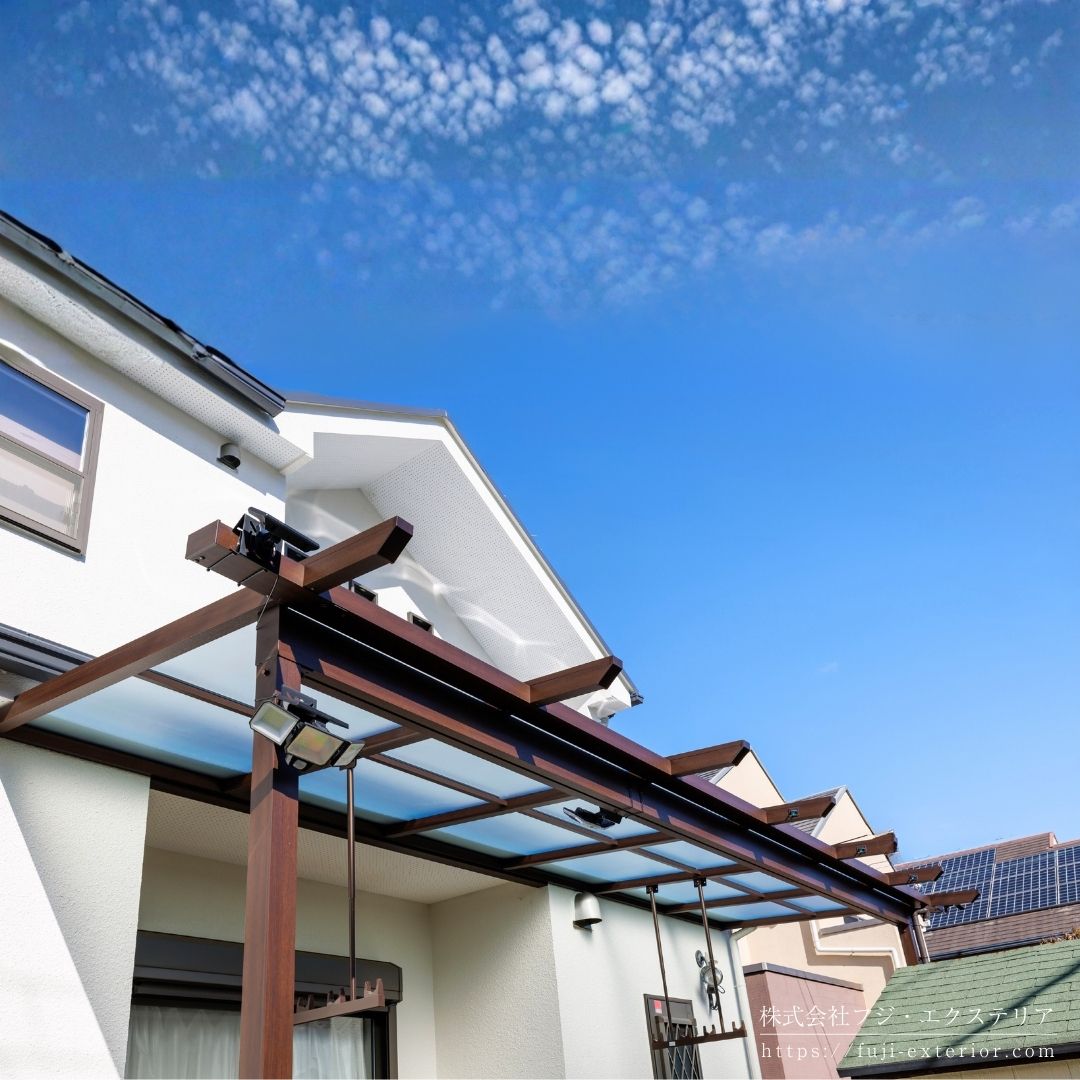 LDKの掃き出し窓の外にはデッキテラスを造り、その上にガーデンルーム(LIXIL ガーデンルームGF)を設置。家に直付け工事はできないので鳥居を組み対応。屋根材はアクアシャインポリカで雨で汚れを洗ってくれます。