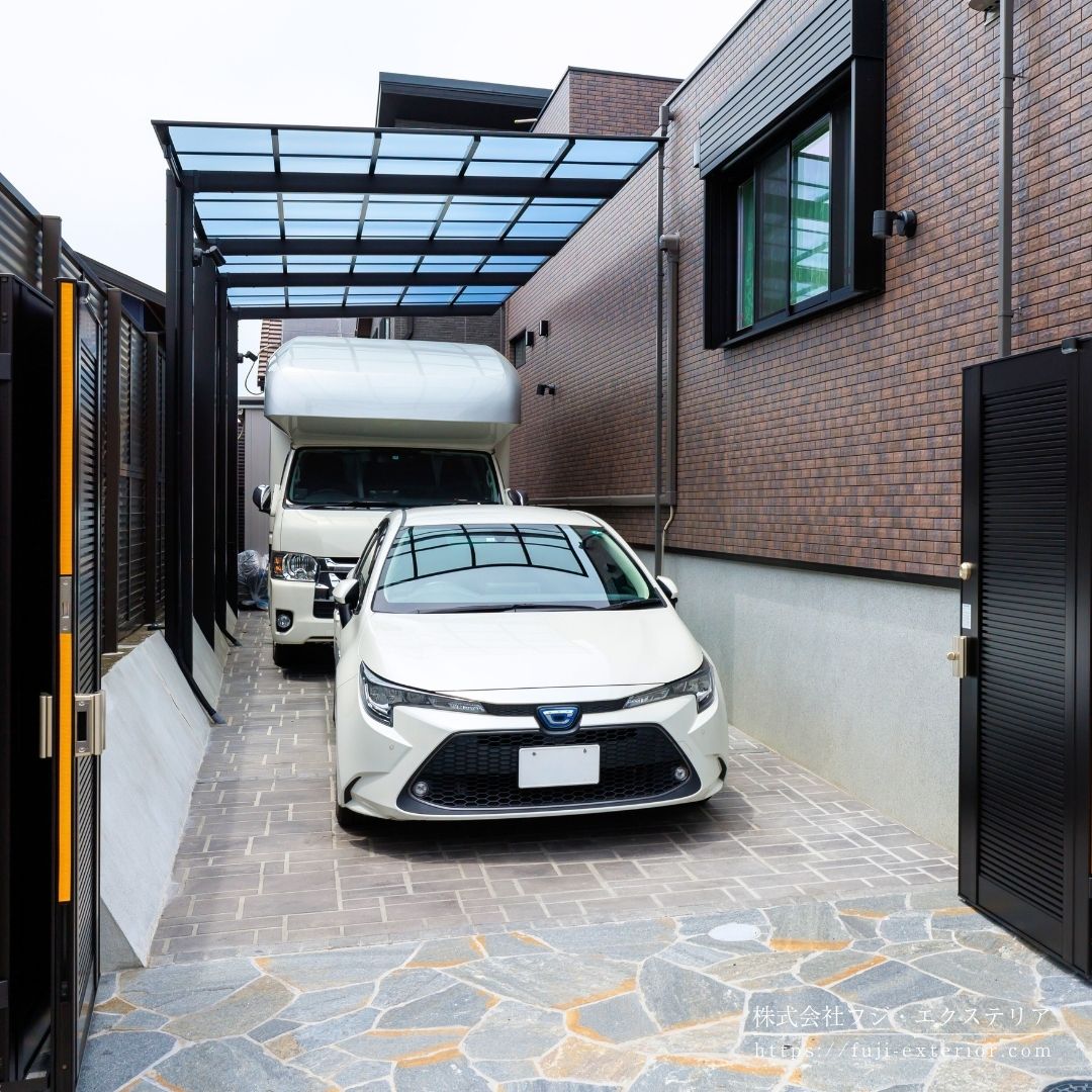 シャッターゲートを開けると広大なカースペースが登場します。LIXIL ネスカF MAXサイズ縦2連棟で、大型車4台が余裕を持って駐車できます。側面パネルも取付け、隙間からの雨やホコリ等を防ぎます。