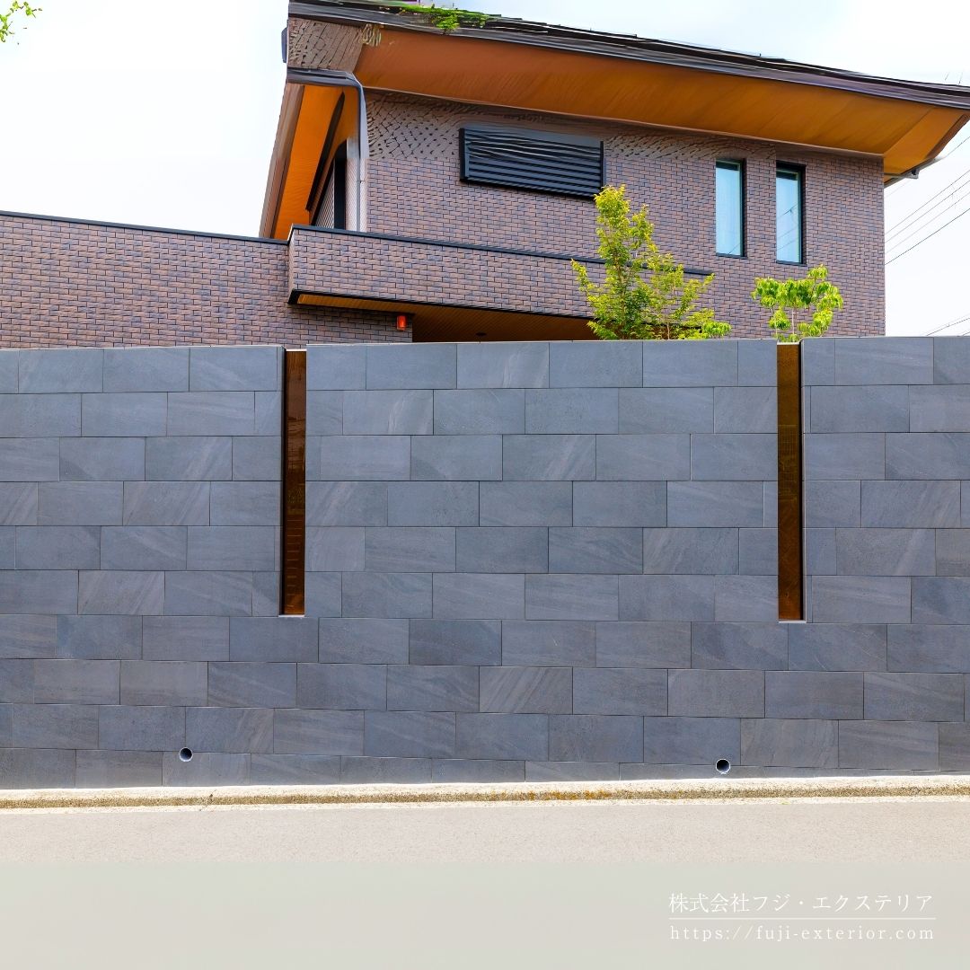 道路面はブロックと四国化成 アートウォールで壁を。ZERO社オリジナルタイルとガラスマテリアルのブラウン・ティンクルⅡでアクセントを入れました。
