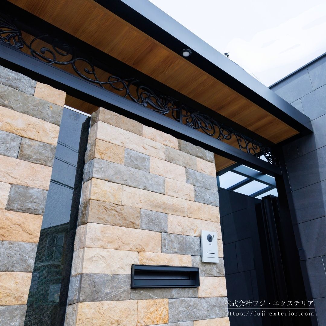 門廻りの全景です。敷地が広く門扉から玄関まで距離があるので、LIXILプラスGでエントランスルーフを造りました。高さは3.5mあり、屋根の4方向に柱を増設して補強しています。