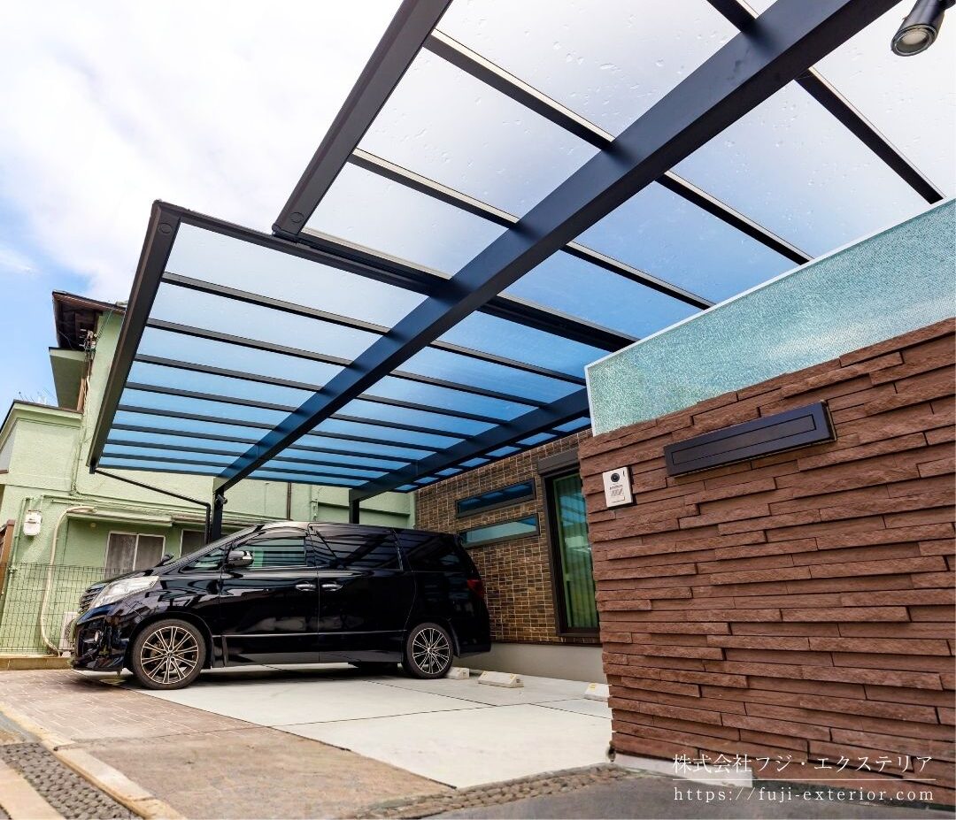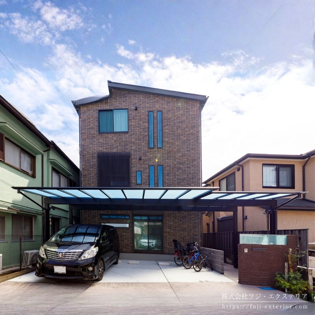大型カーポートと門柱が主役のエクステリア|大阪の外構