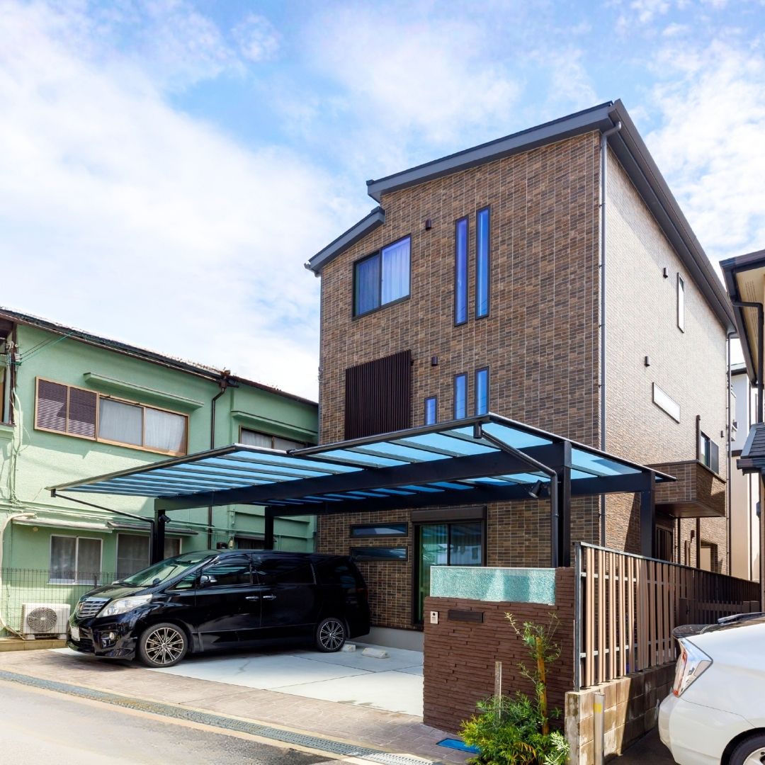 LIXIL プラスGでファサードを構築しました。カーポート屋根は最大サイズにし、お車+自転車3台も楽々留めれる屋根付きガレージになりました。