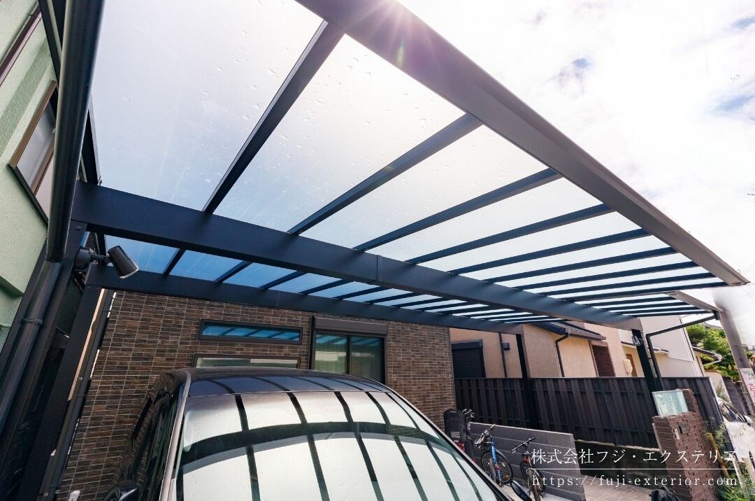 カーポートは幾何学模様デザインが人気の三協アルミ Mシェード 。屋根材の熱線遮断防汚ポリカーボネートは、光を採り込みながらも紫外線はほぼ100%カット、太陽熱もカットしてお車を守ります。 防汚効果付きの屋根材は、汚れが付着しても雨水などの流水だけで簡単に汚れが流れ落ちます。