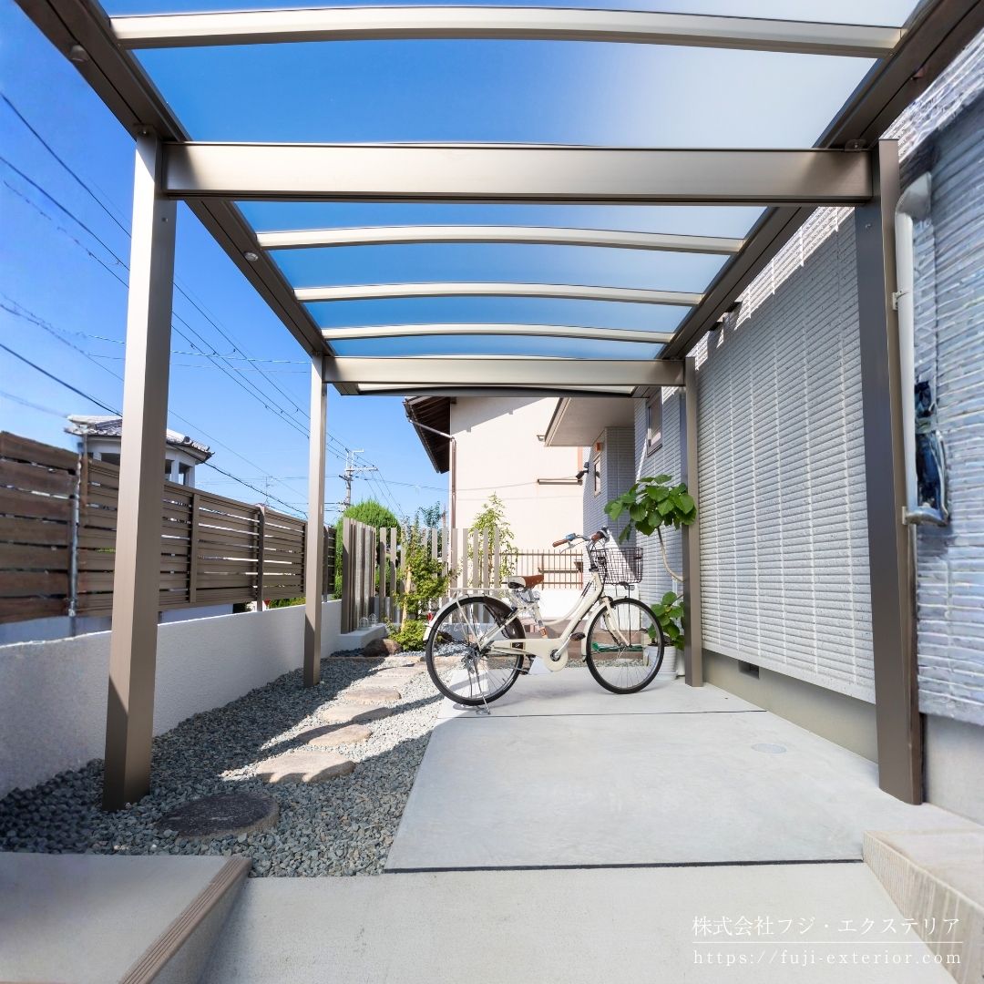 駐輪場の屋根は3枚設置しています。リフォーム工事なので既存建物に高さを合わせないといけません。大きさ、高さ等バラバラになりましたが、職人さんの技量で極力雨が入り込まないようにラップさせて納めました。屋根材はもちろん熱線ポリカーボネート材で、明るさを維持しながら太陽熱や紫外線をほぼ99%カットします。