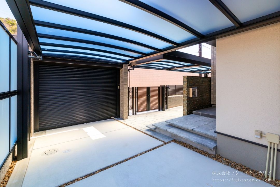 こだわりに拘った、エクステリア・リノベーション工事が完成しました。土地の間口が約8m強あり、アプローチからガレージ部、全面にカーポート屋根がご希望でした。ご希望の条件をすべて叶えるのは、三協アルミ U.スタイルアゼストだけでした。